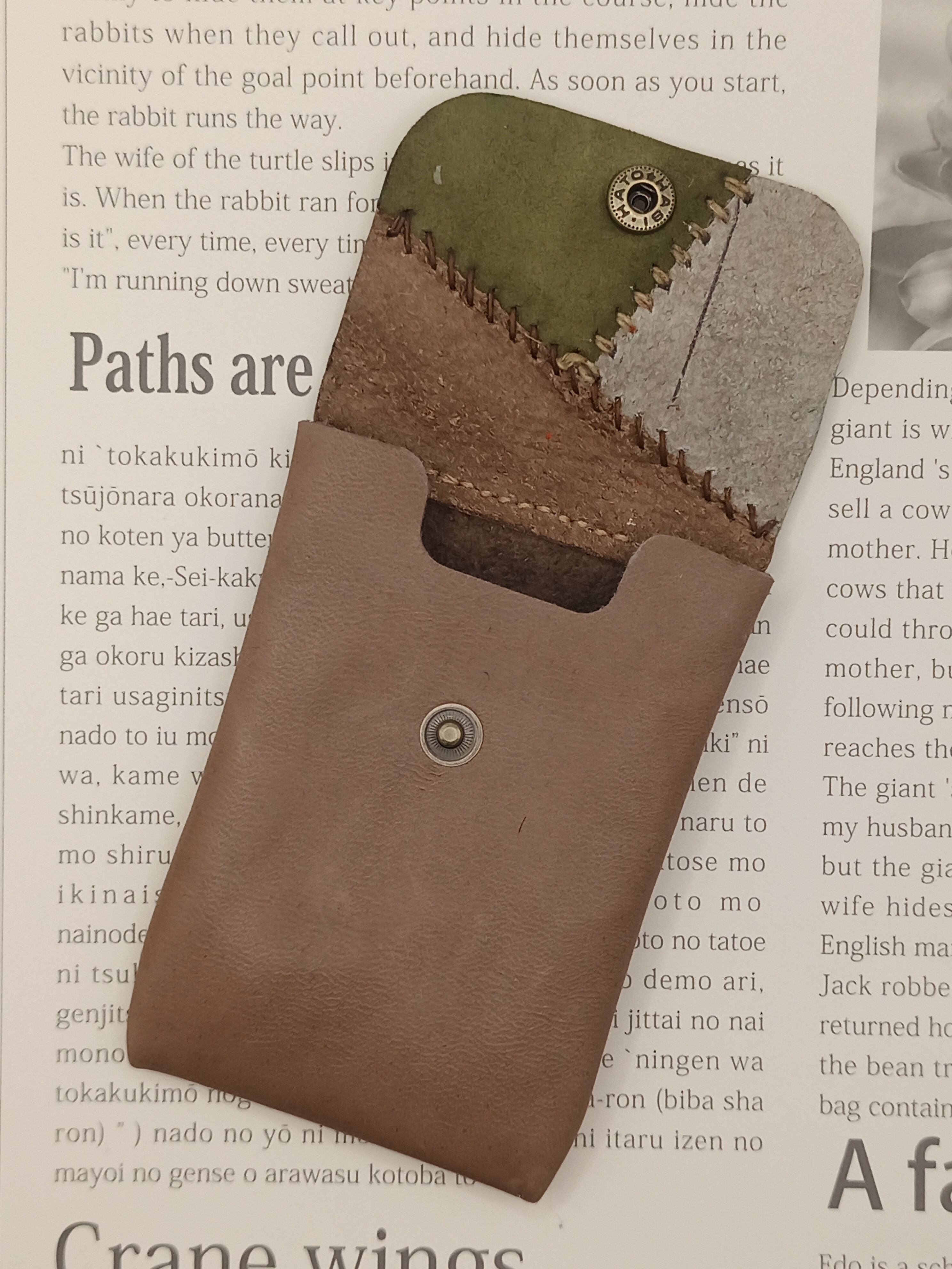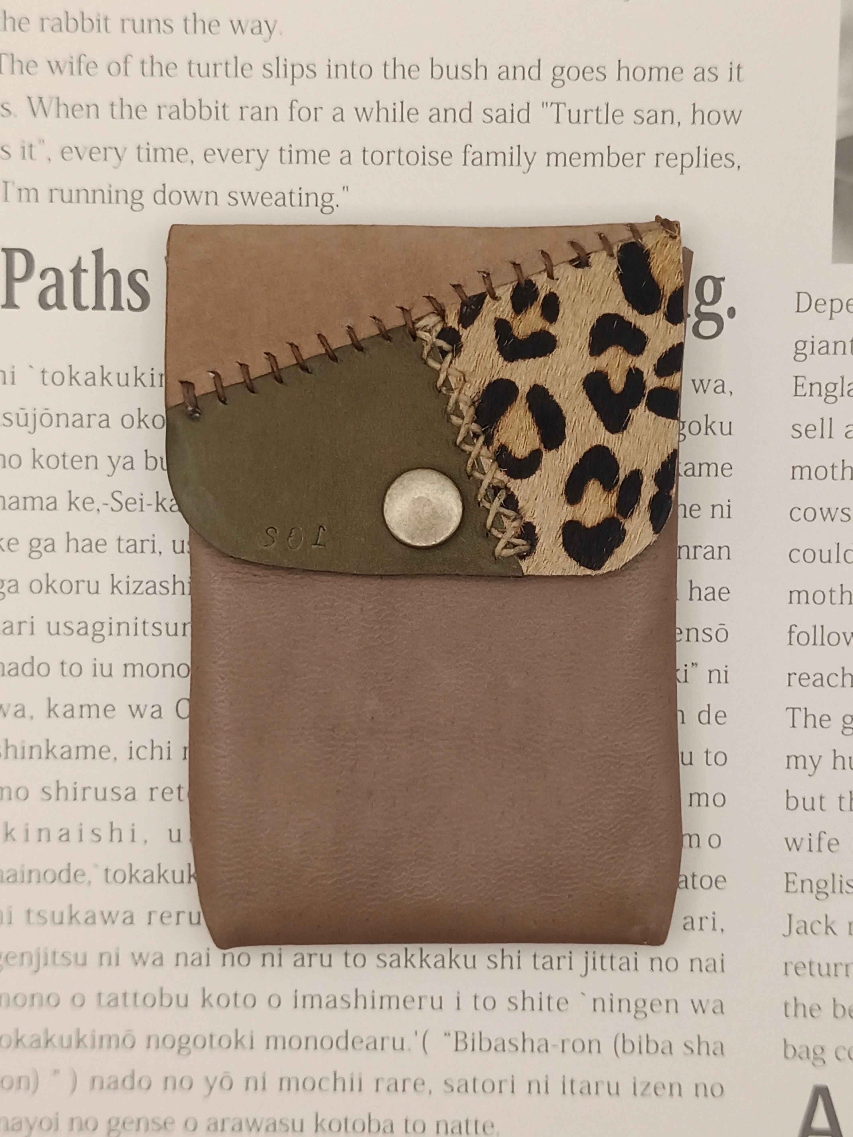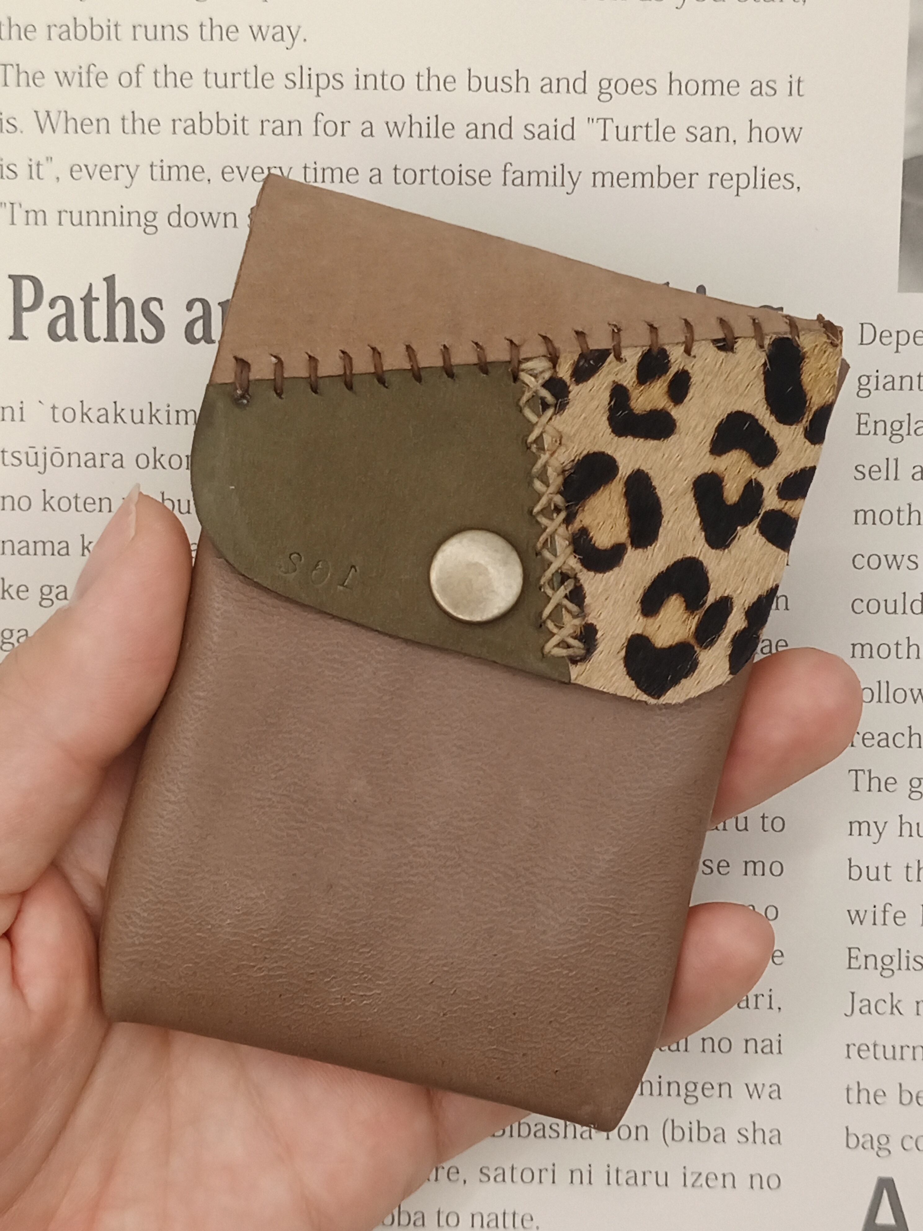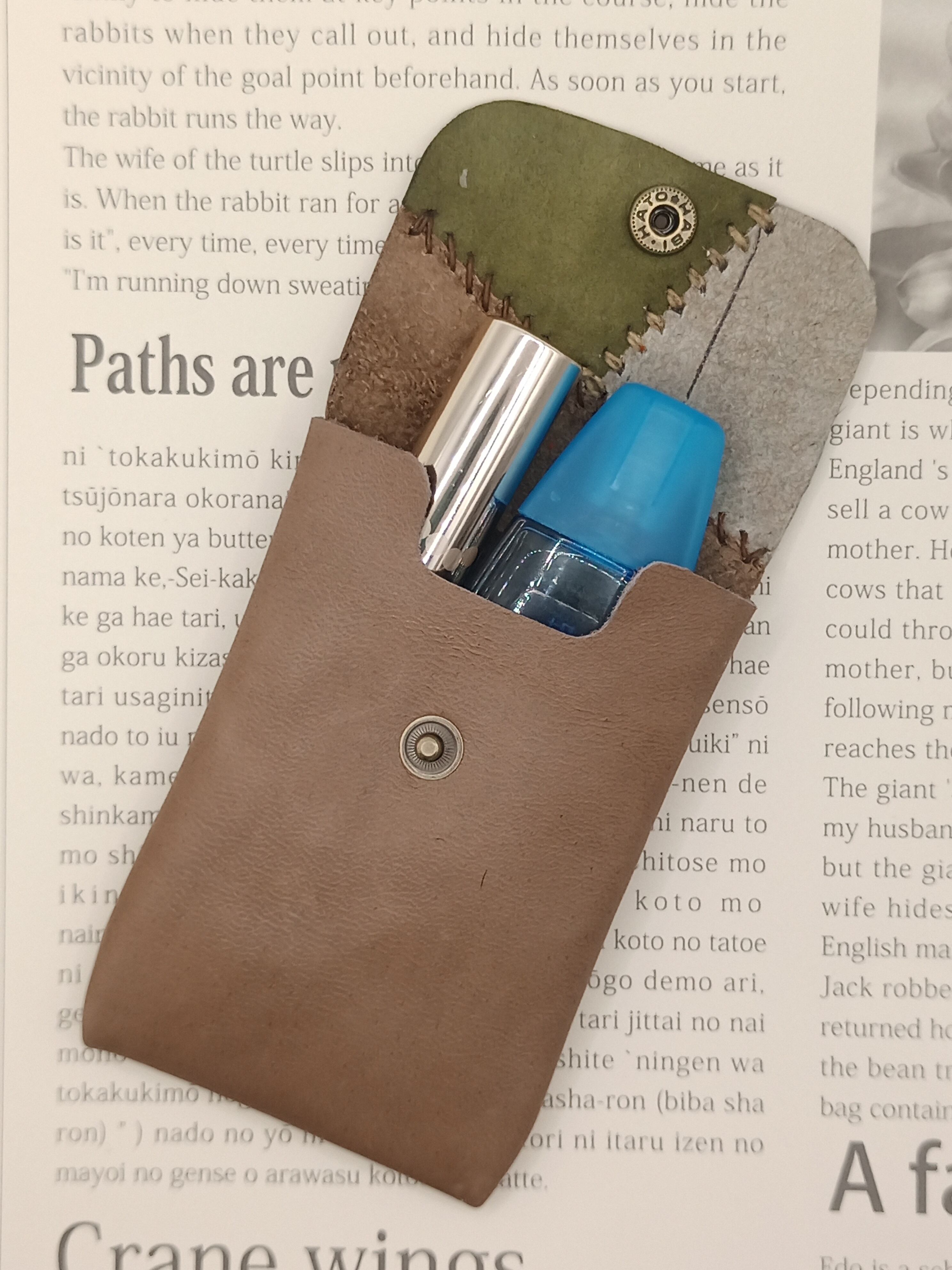 リップクリームや目薬など持ち歩きたい小物入れにピッタリ。フラップ部分がパッチワークでキュート。本体は柔らかめの革で出来ています。