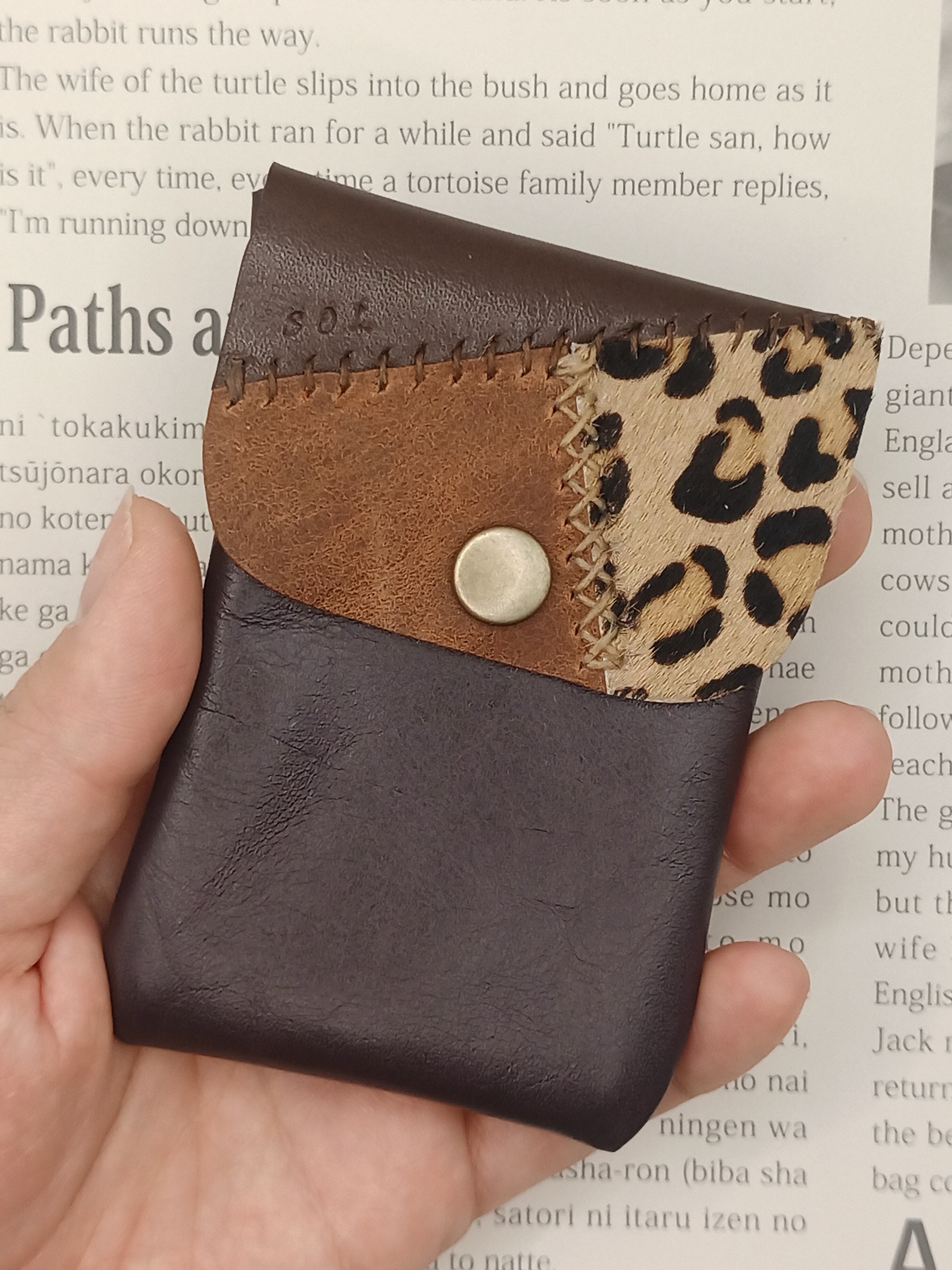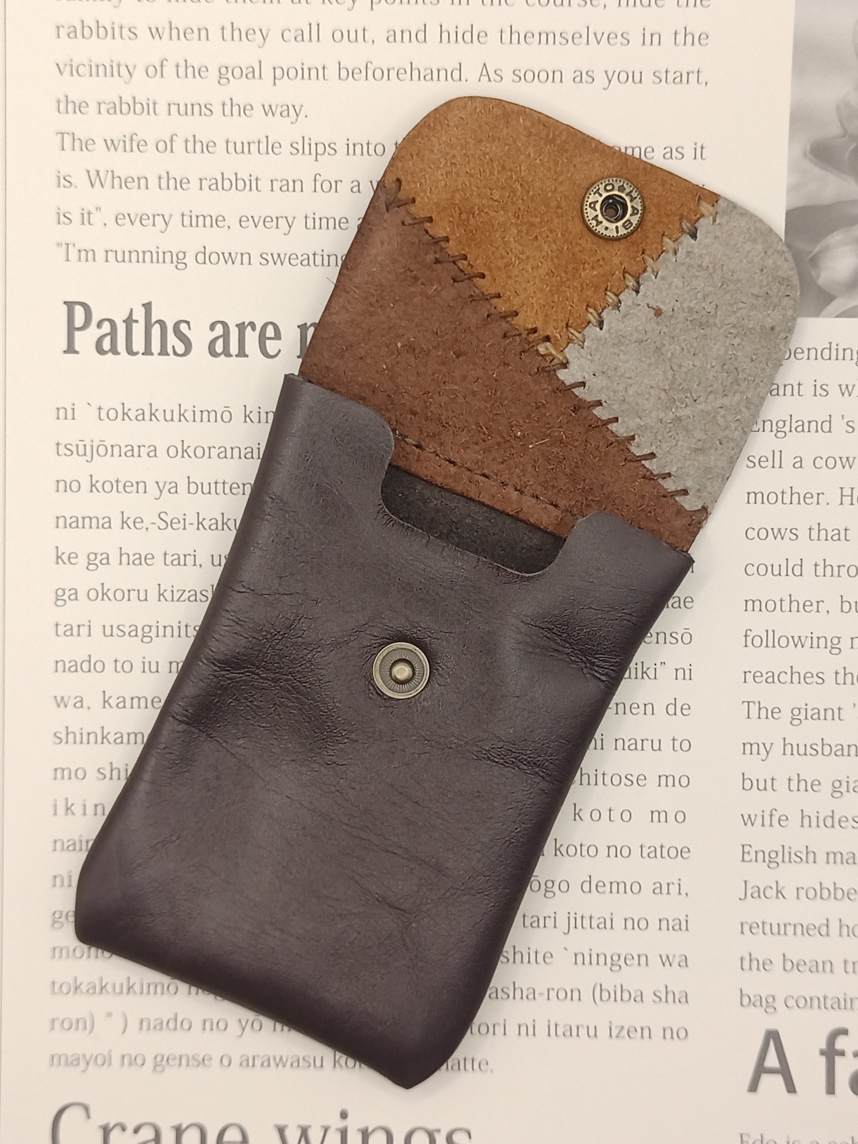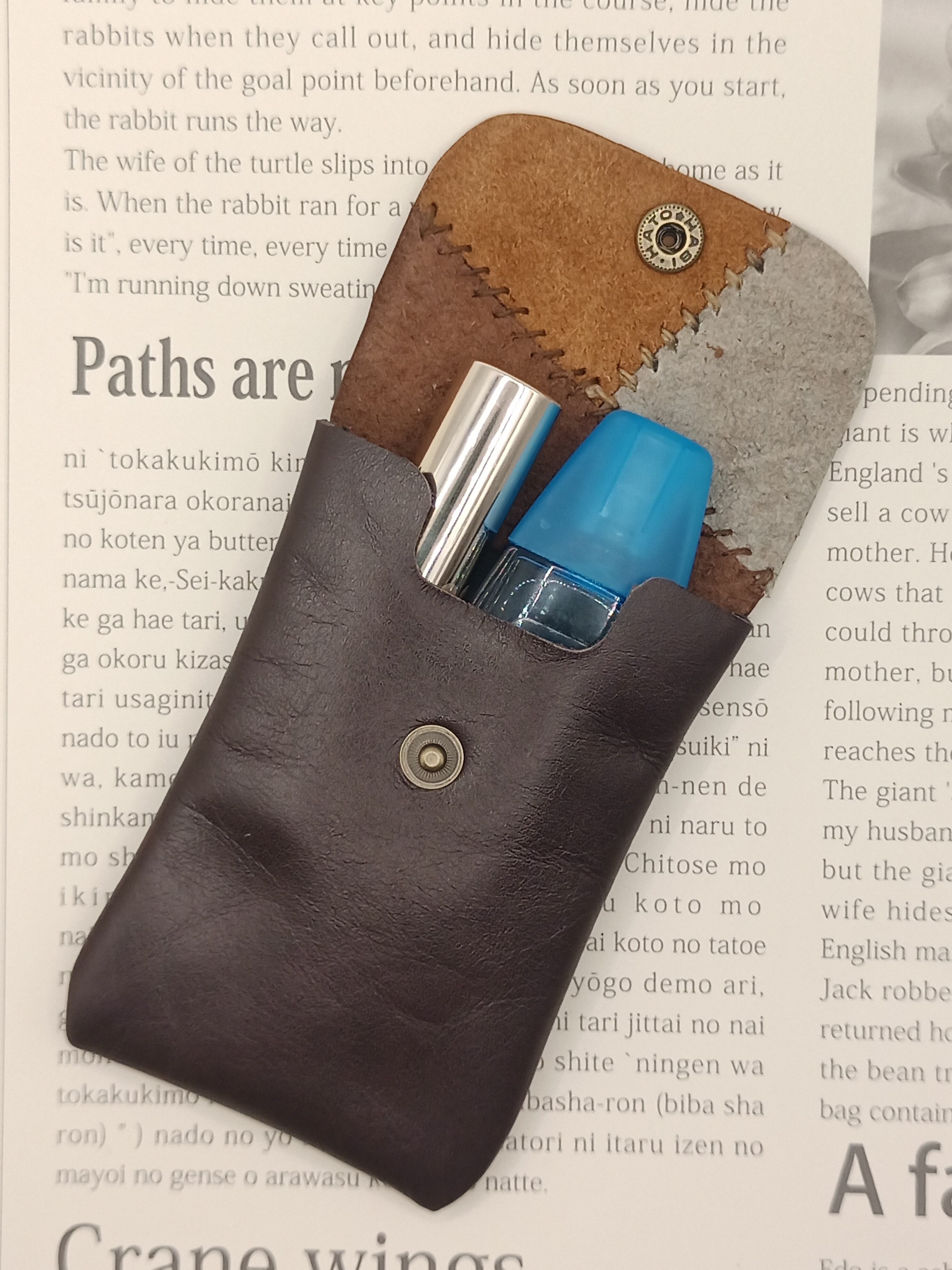 リップクリームや目薬など持ち歩きたい小物入れにピッタリ。フラップ部分がパッチワークでキュート。本体は柔らかめの革で出来ています。