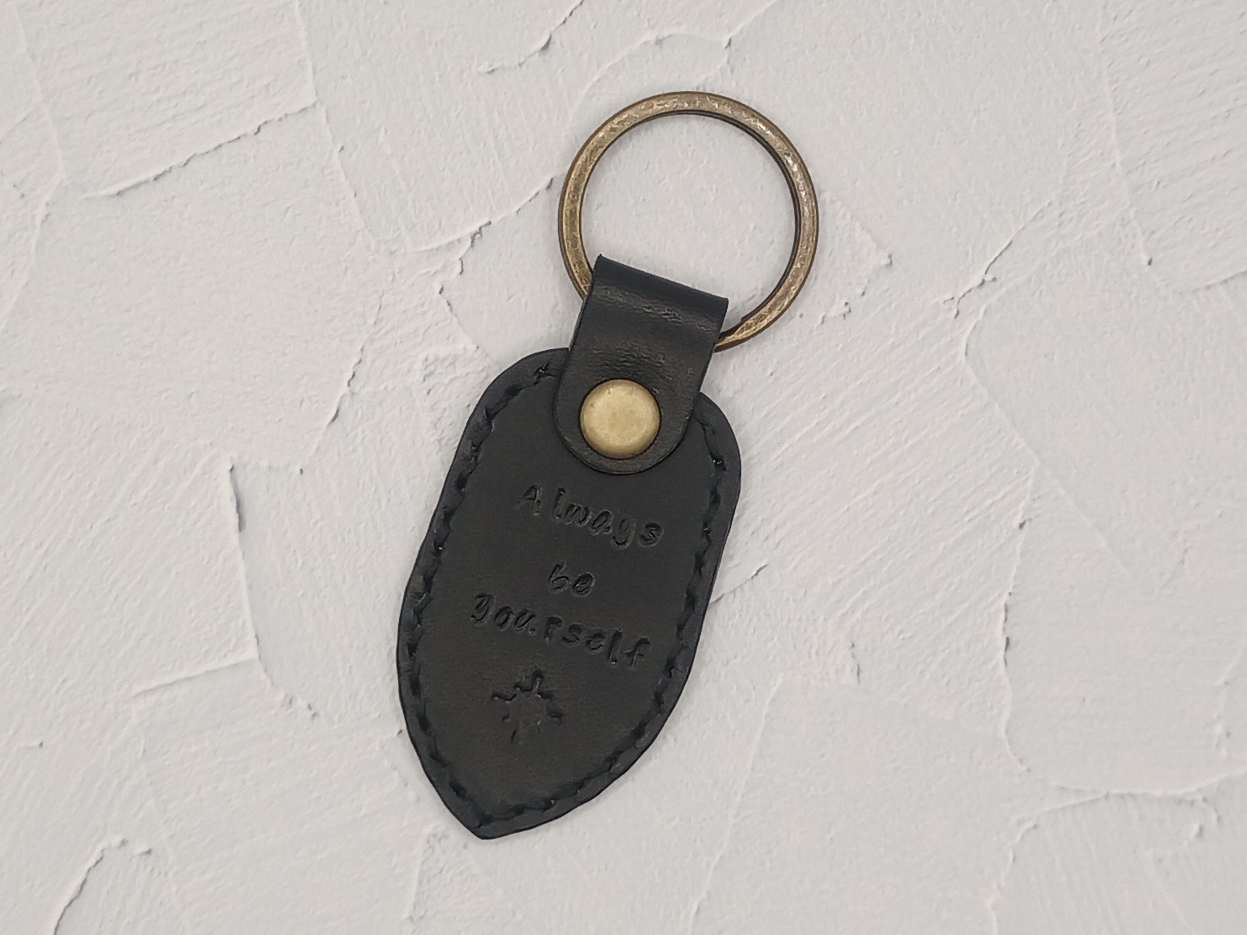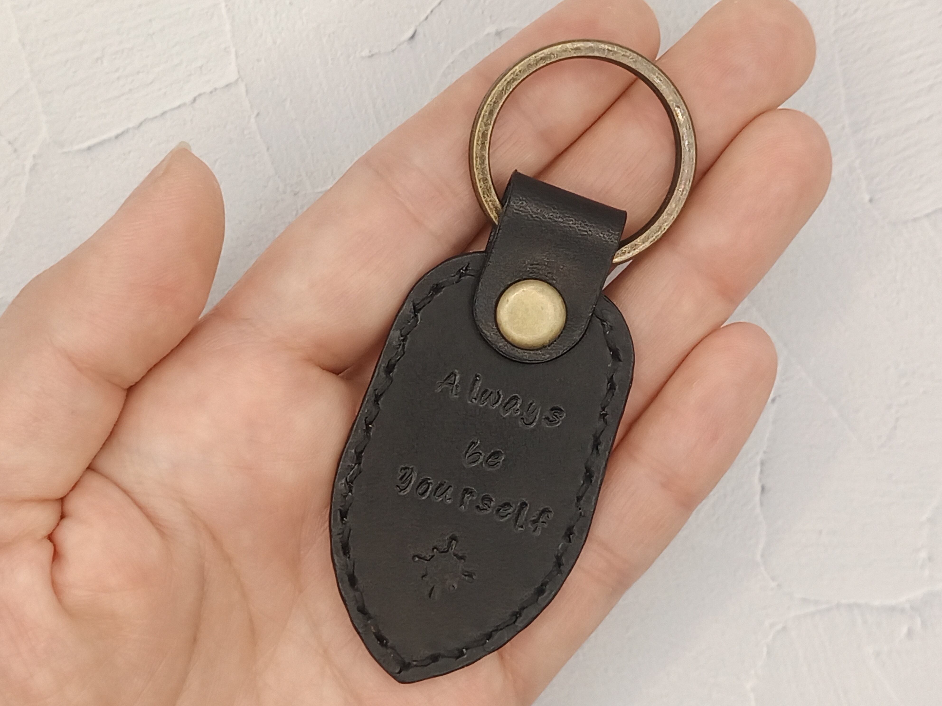 本革を使用したメッセージ刻印のキーホルダーです。意味は「あなたはいつもあなたらしく」