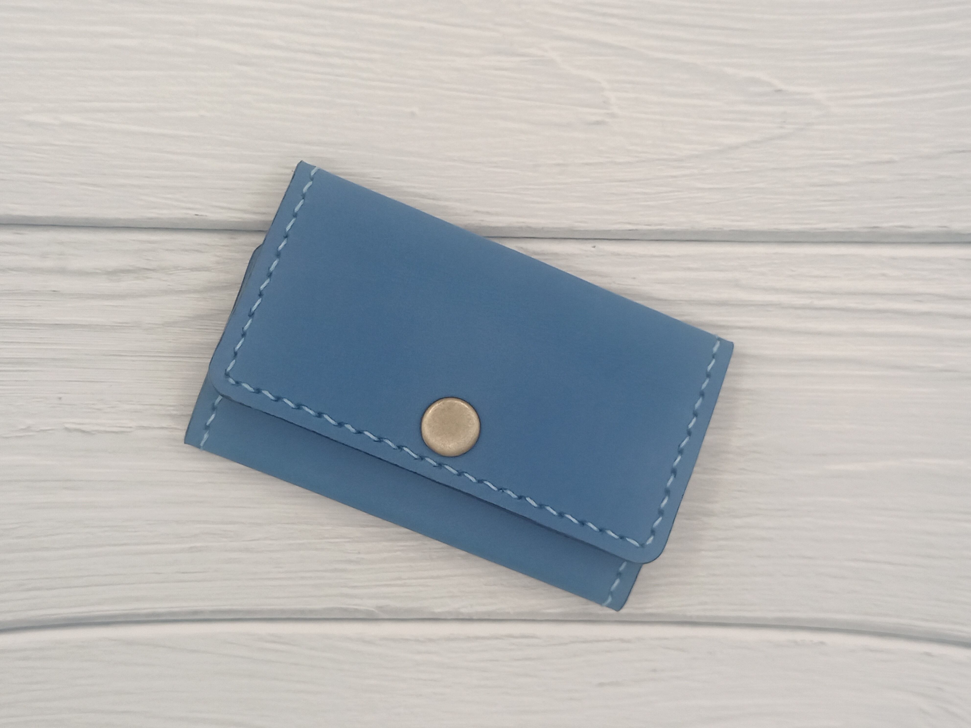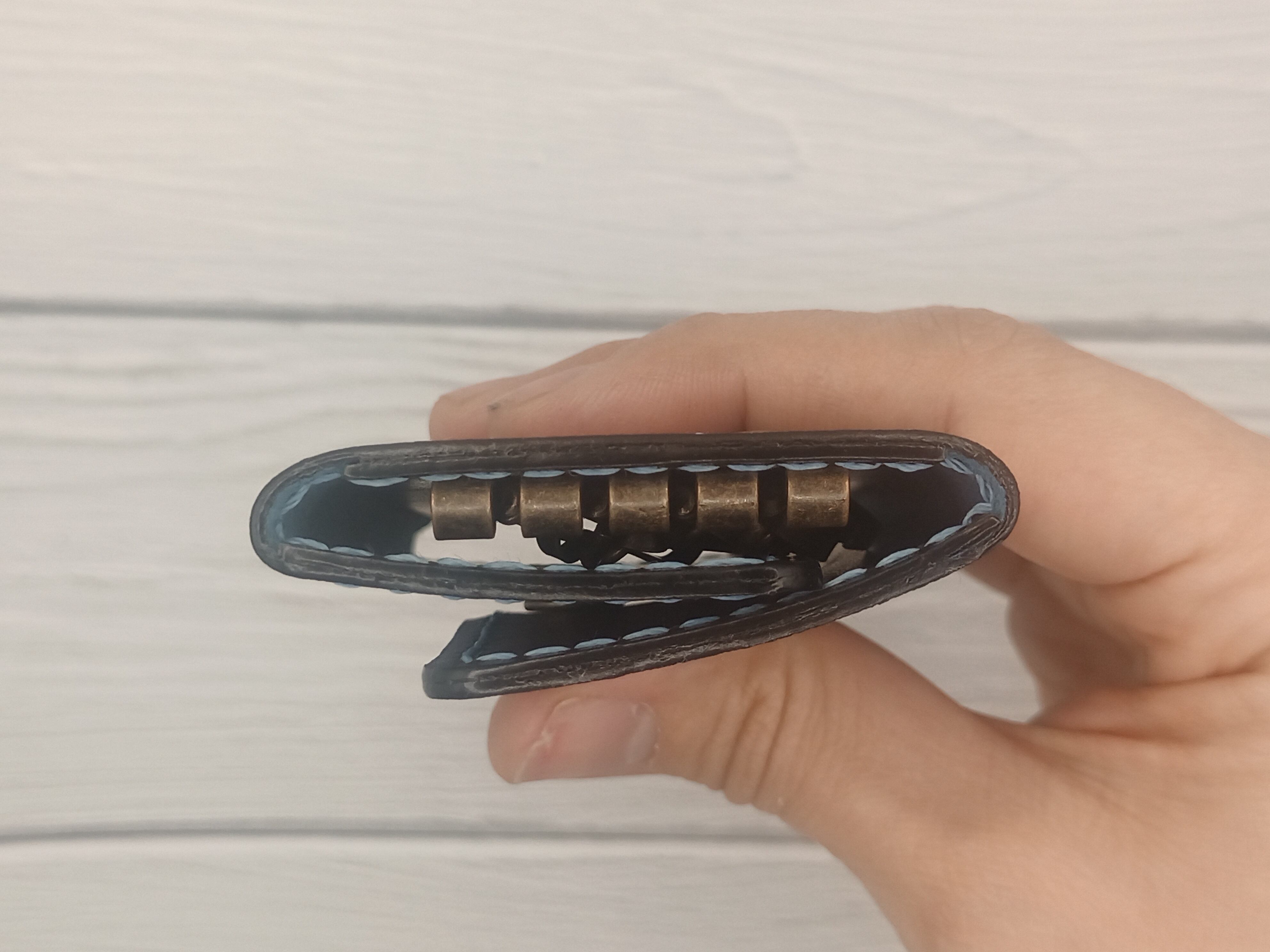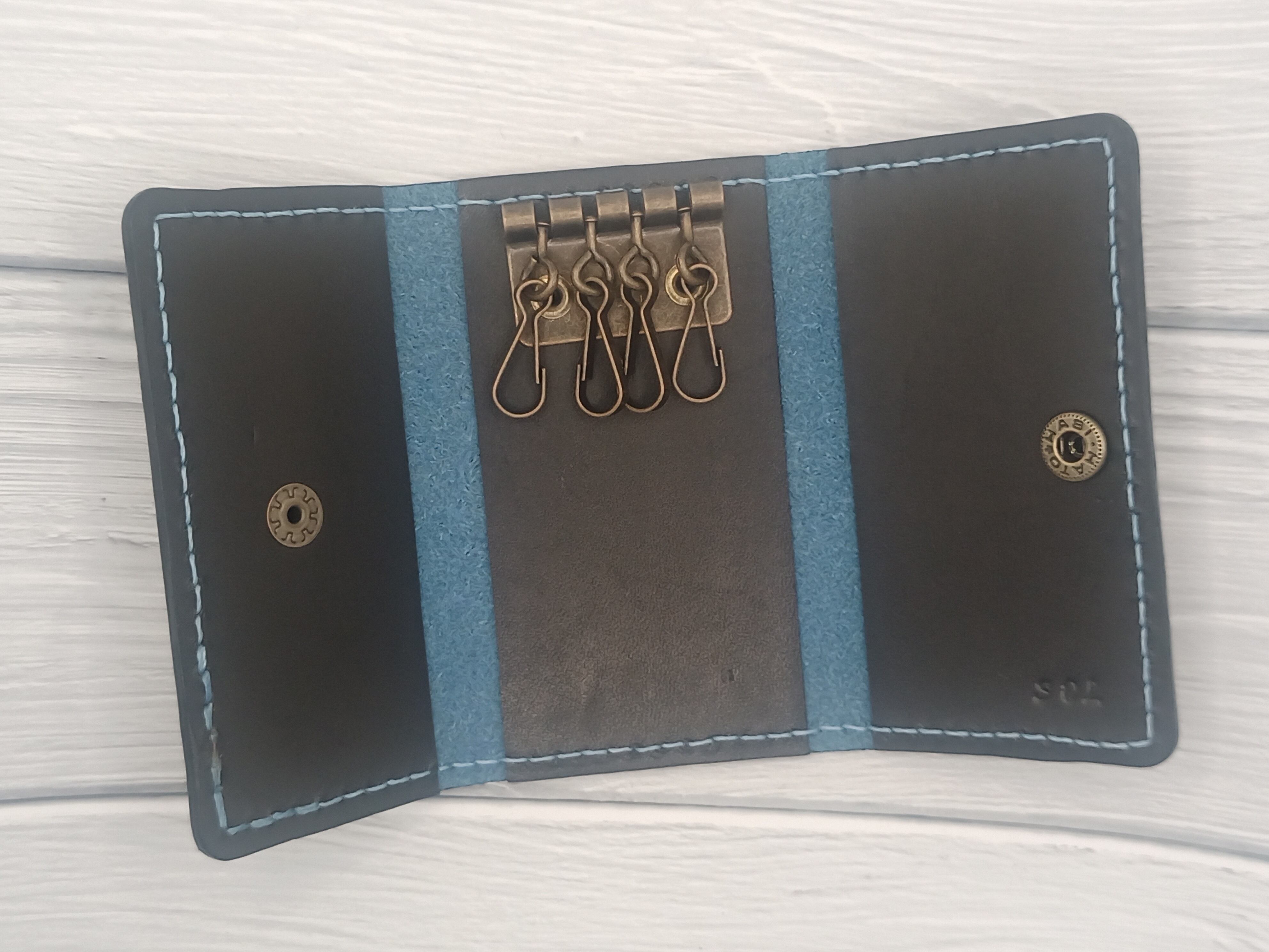 しっかりした硬めの革で仕立てたブルー×ブラックのキーケース。使っていくうちに柔らかくなっていく過程を楽しんでいただきたい。