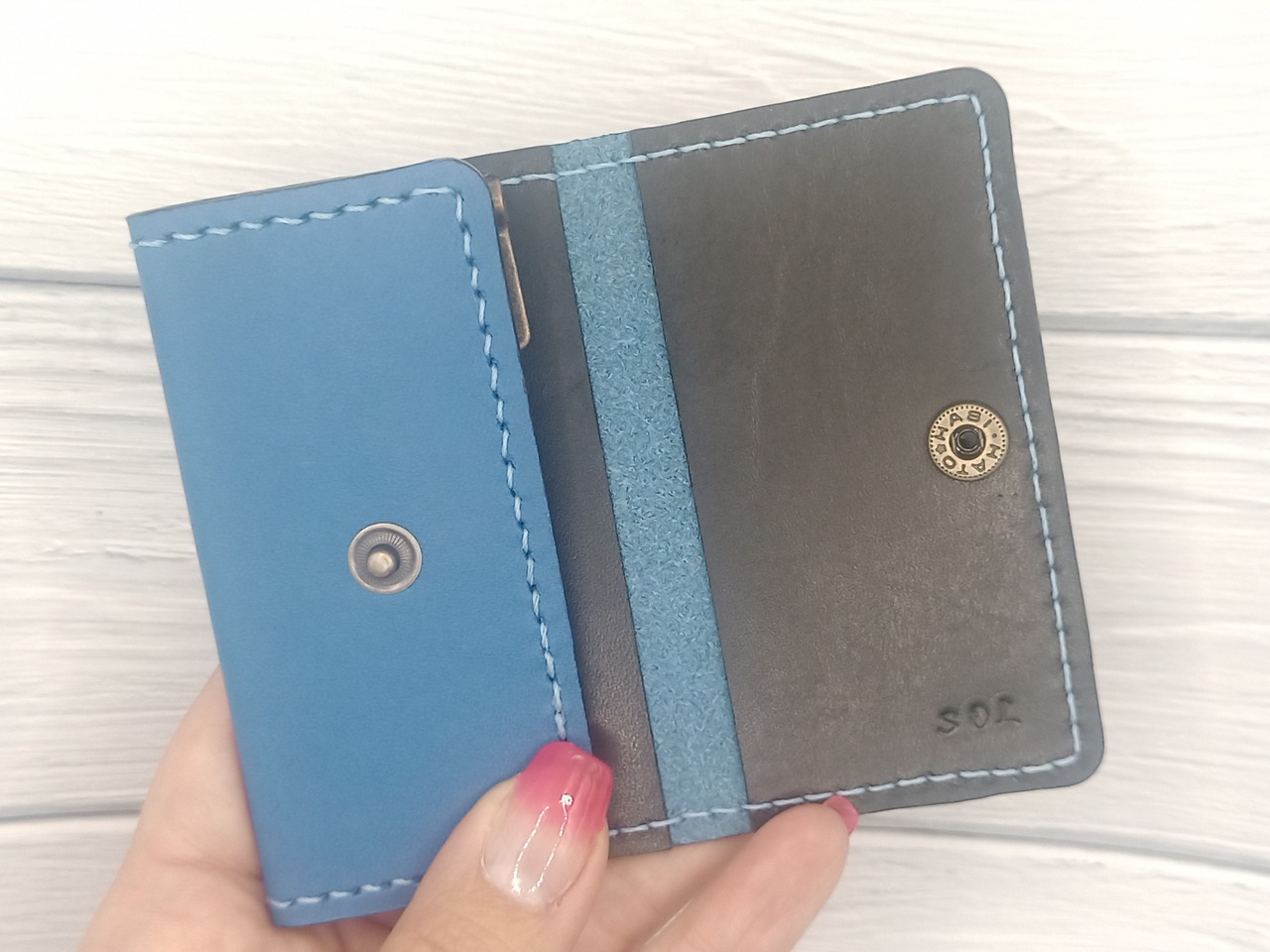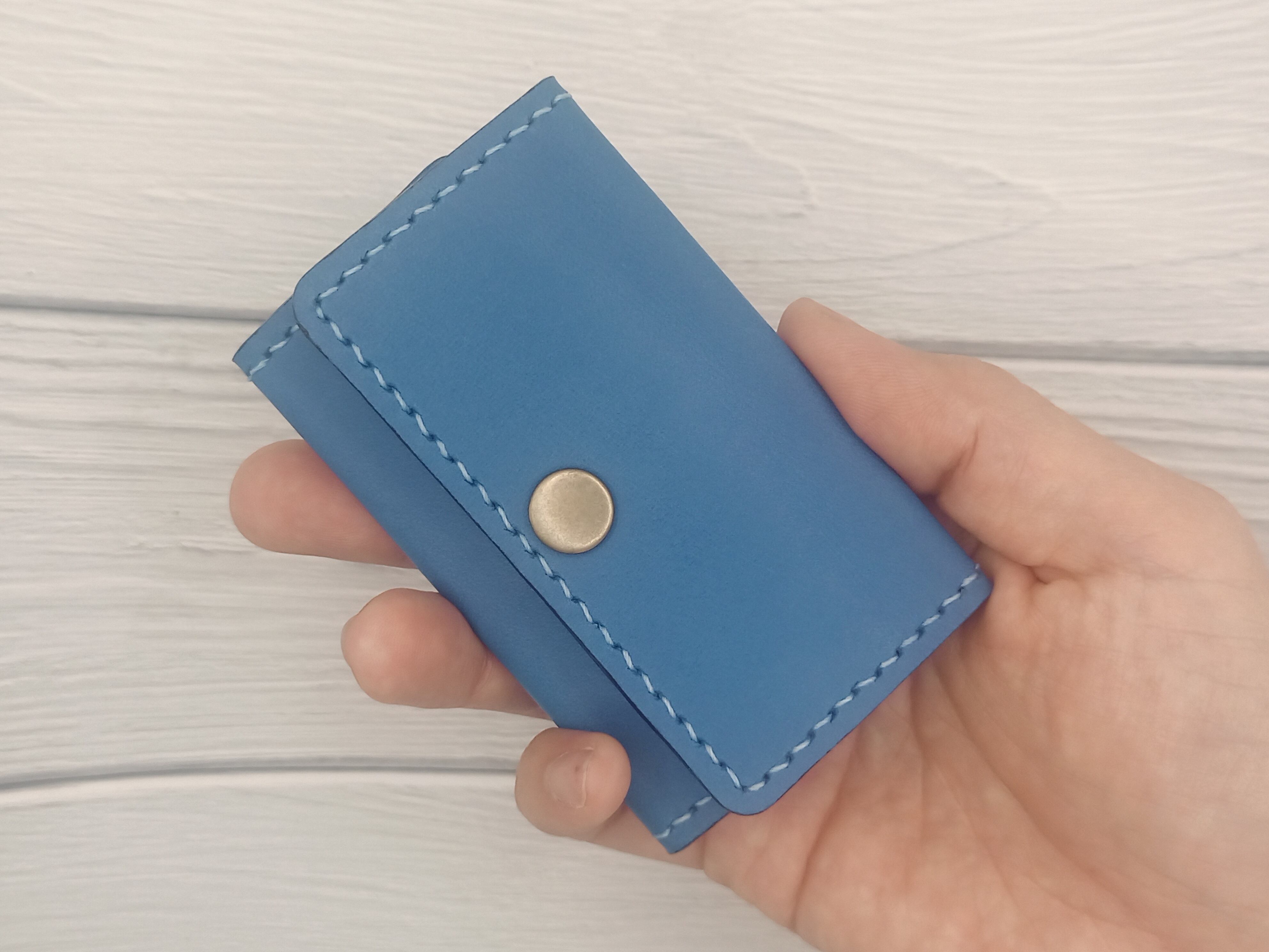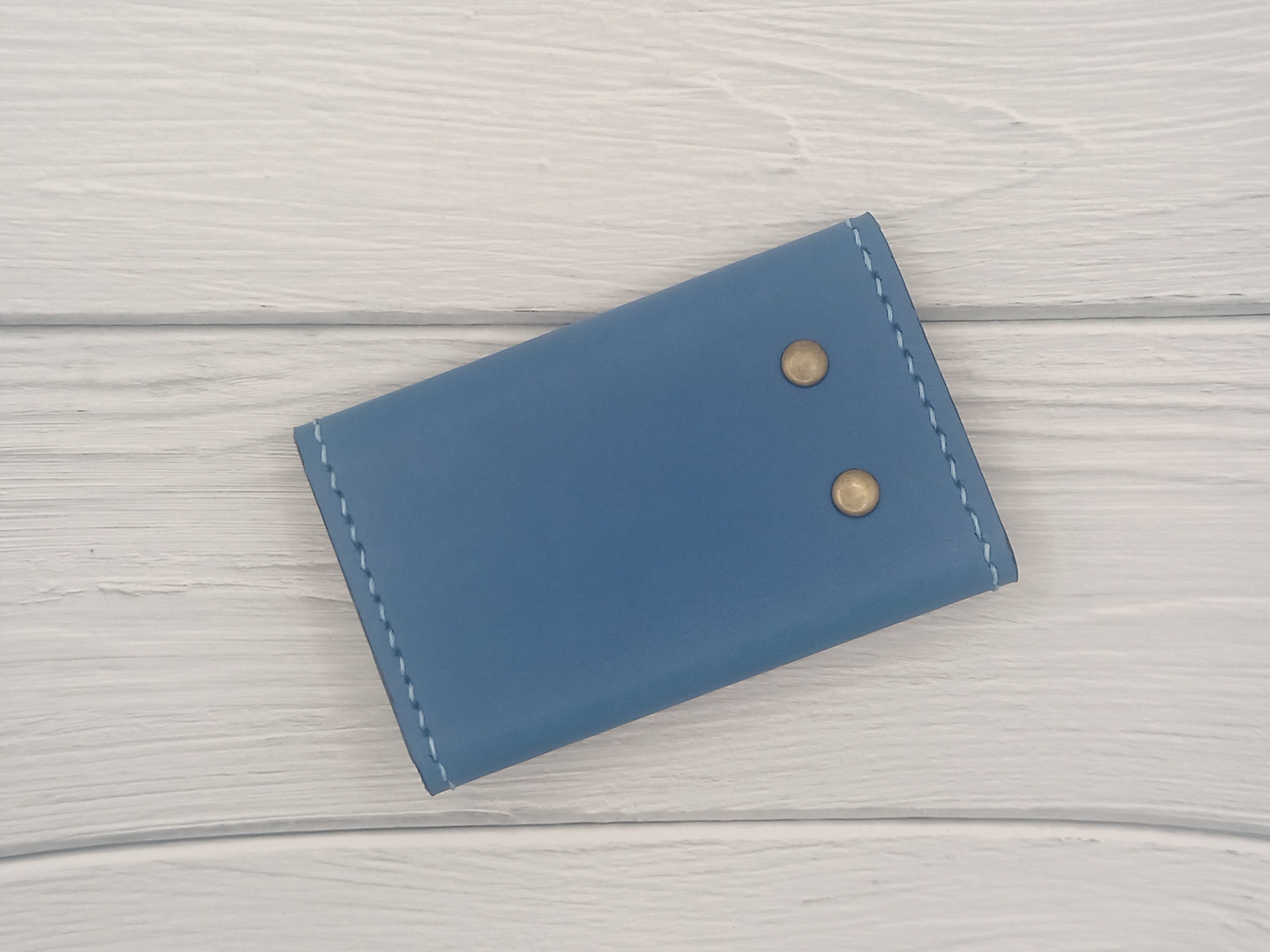 しっかりした硬めの革で仕立てたブルー×ブラックのキーケース。使っていくうちに柔らかくなっていく過程を楽しんでいただきたい。