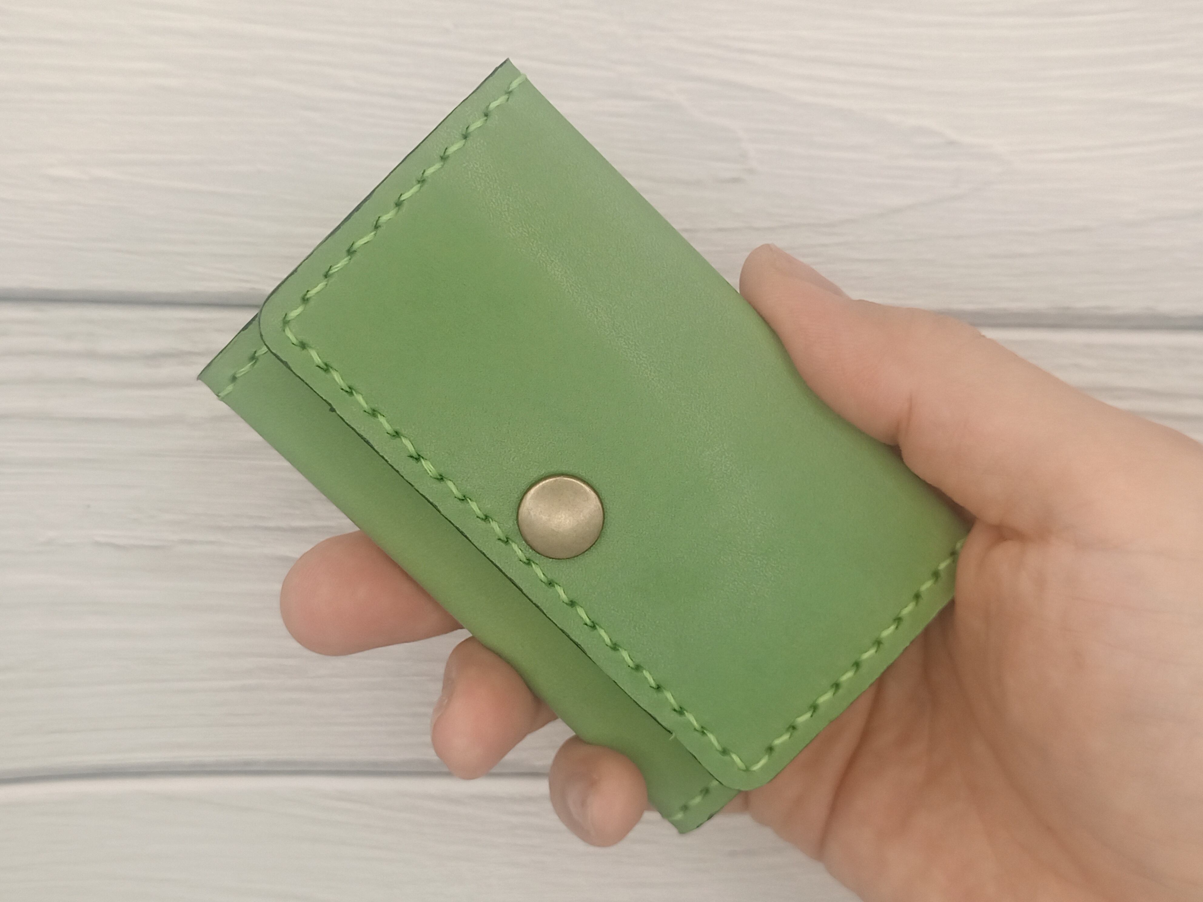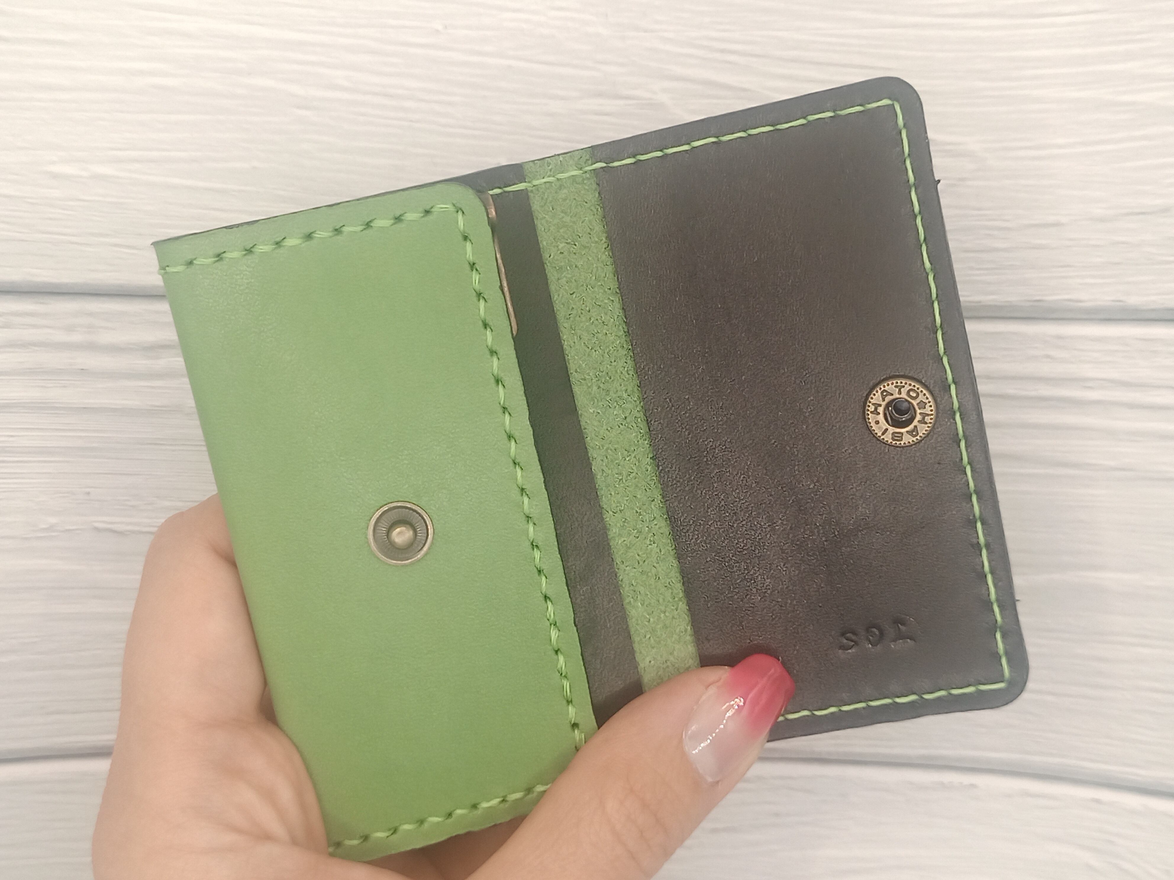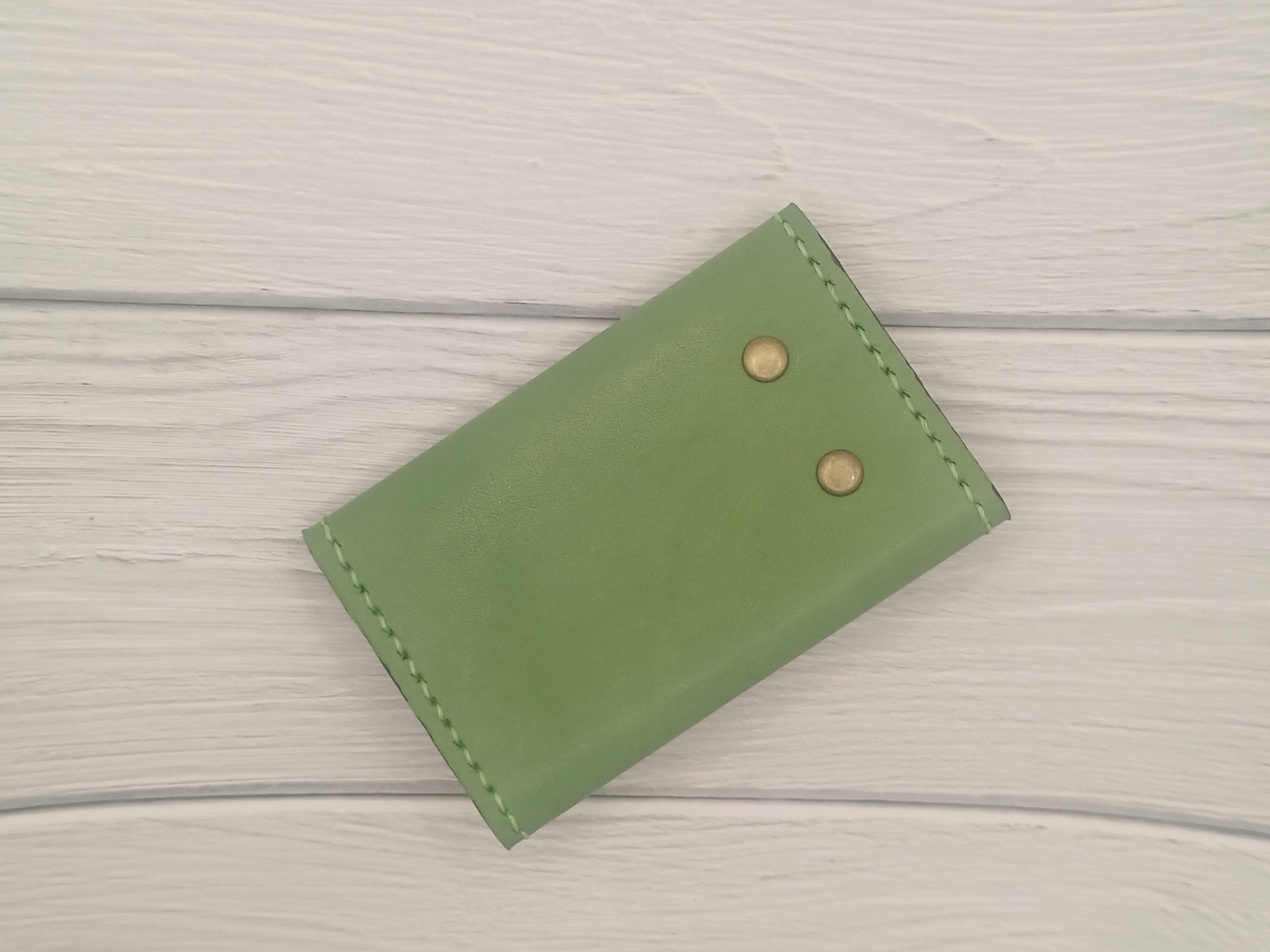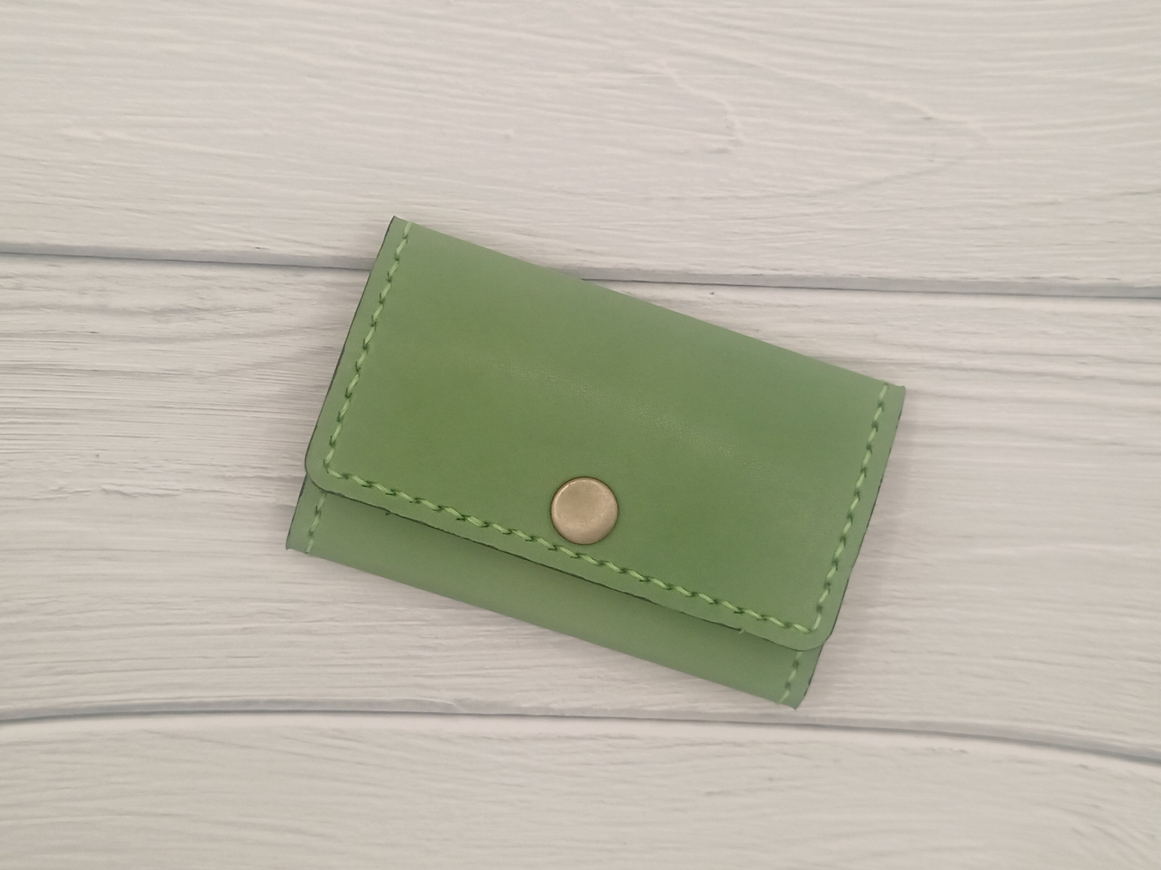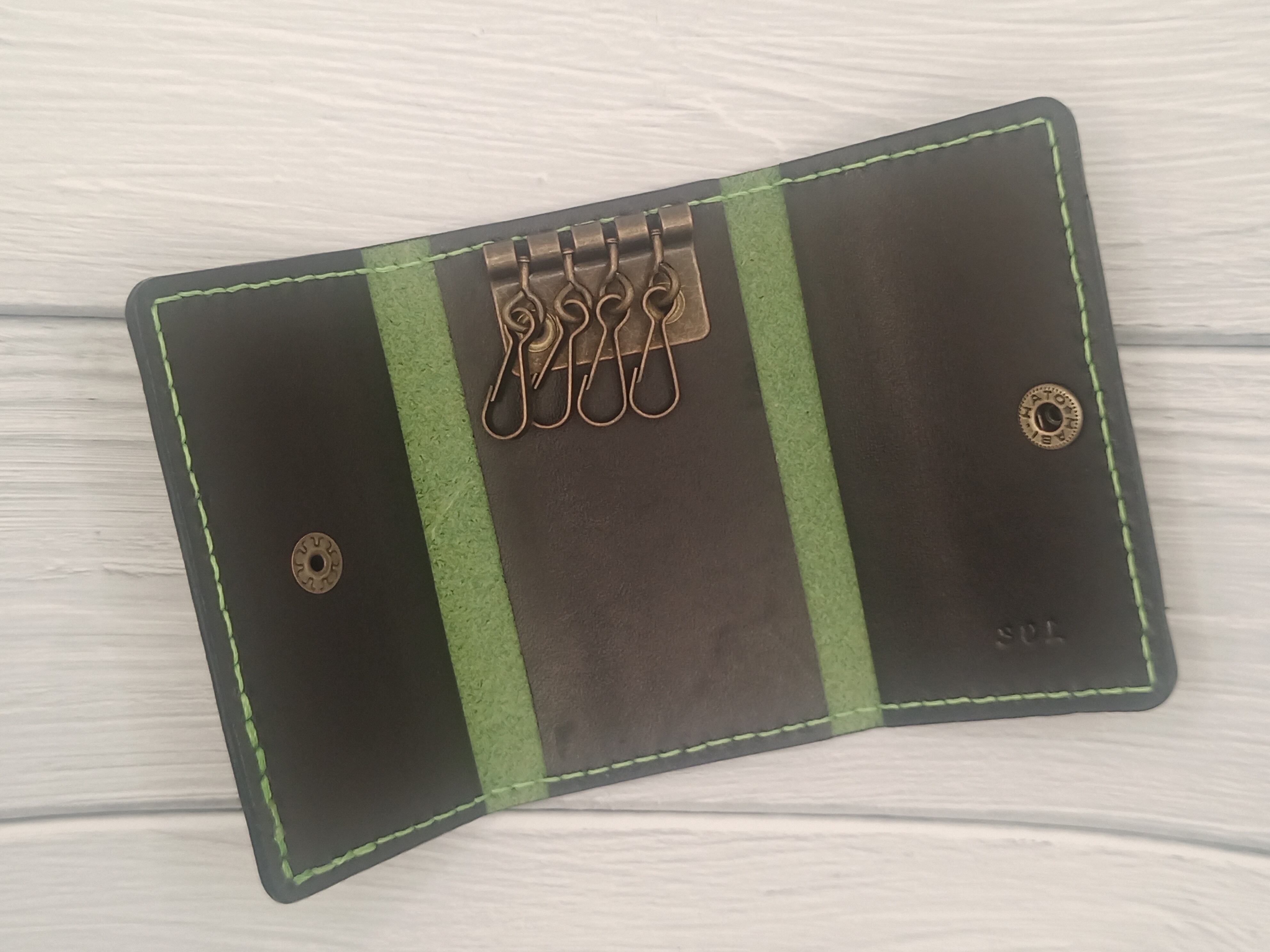 しっかりした硬めの革で仕立てたグリーン×ブラックのキーケース。使っていくうちに柔らかくなっていく過程を楽しんでいただきたい。